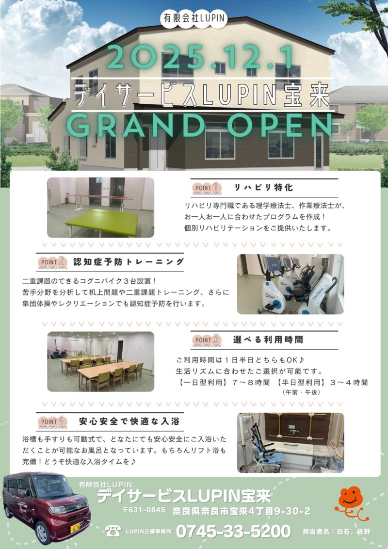 2025年12月1日(月)、奈良市宝来に「デイサービスLUPIN宝来」が新規オープンします。