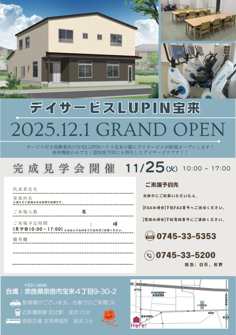 オープンに先立ち、「デイサービスLUPIN宝来」の完成見学会を開催いたします。